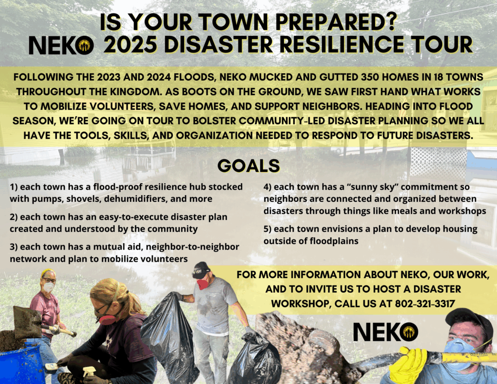 We’re going on tour to bolster community-led disaster planning so we all have the tools, skills, and organization needed to respond to future disasters. Our goal is to visit 15 towns in the Kingdom and raise $50,000 to print the Hub Toolkit and resource our resilience hub network with new locations and tools like shovels, generators, and dehumidifiers.